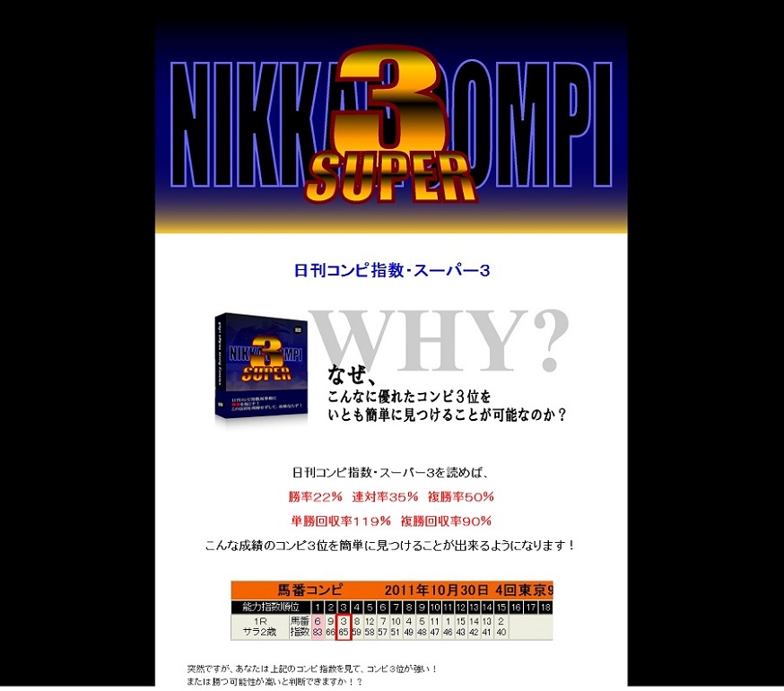 今まで世に氾濫していたコンピ指数馬券術に手順が似ていますが、「日刊コンピ指数・スーパー3」はまったく違います。